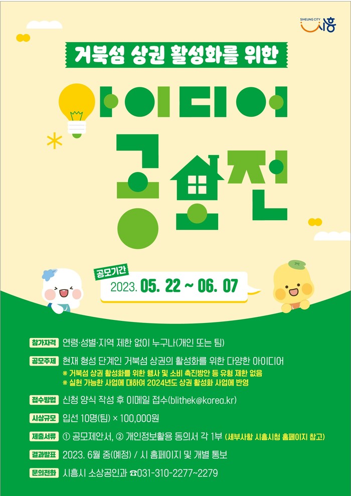 이메일(blithek@korea.kr)로 접수하면 된다. 아이디어 공모전 관련 세부 사항은 시흥시청 누리집을 통해 확인할 수 있다.