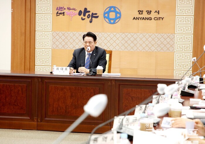 | ▲ 최대호 안양시장이 ‘경부선 철도지하화 및 상부개발 중간보고회’를 주재하고 있다. (사진출처=최대호 페이스북) |
