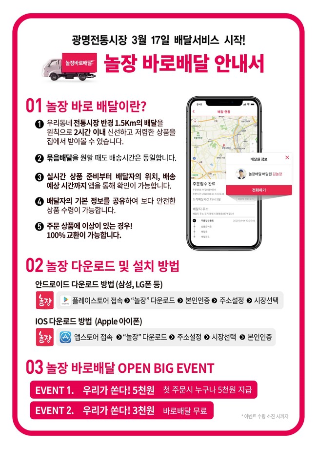 아울러 광명시는 ‘놀장’ 운영 기념으로 선착순 1,000명에게 5,000원의 쿠폰과 2,000명에게 배달수수료 3,0000원 무료 이벤트를 진행할 예정이다. 광명전통시장 배달앱 ‘놀장’에 대한 문의사항은 광명전통시장 조합사무실(02-2680-0006) 또는 광명시 지역경제과(02-2680-6379)로 문의하면 된다.