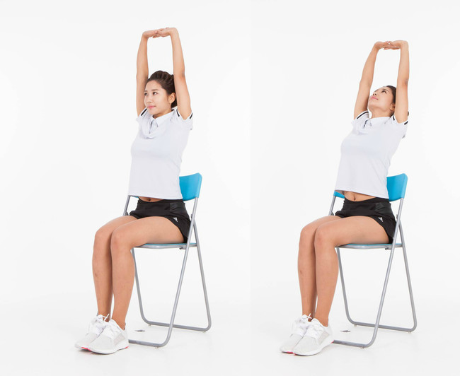 방법은 간단하다. 우선 양손을 깍지 낀 후 머리 위해 쭉 올린다. 머리 위로 손을 쭉 올리면서 목과 윗몸을 살짝 뒤로 젖히면 된다. 뒤로 젖힌 자세를 10초간 유지하고 이를 3회 반복하면 된다.