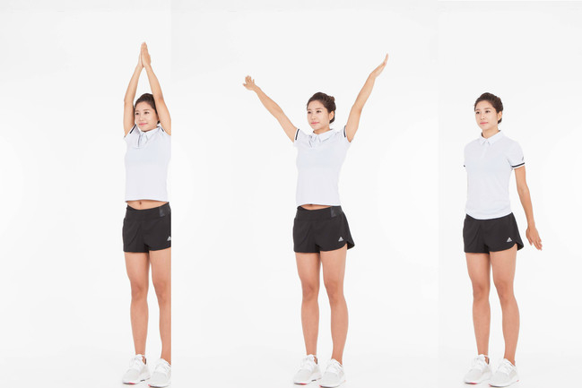 우선 양팔이 귀에 닿도록 손을 끝까지 올린 다음 손바닥이 귀 쪽에서 바깥쪽으로 향하도록 팔을 올리고 뒤로 천천히 젖힌다. 어깨를 최대한 뒤로 밀어준 상태에서 천천히 끝까지 쓸어내린다. 이 동작을 15초 씩 15~10회 반복하면 허리를 곧게 펴는 효과를 볼 수 있다.