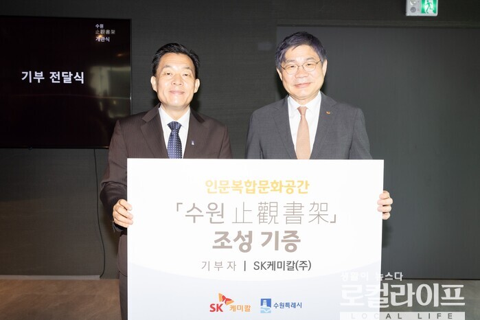 | ▲ 이재준 수원특례시장(왼쪽)이 SK케미칼로부터 ‘수원 止觀書架(지관서가)’ 조성 기증을 받고 있다. (사진출처=이재준 페이스북) |