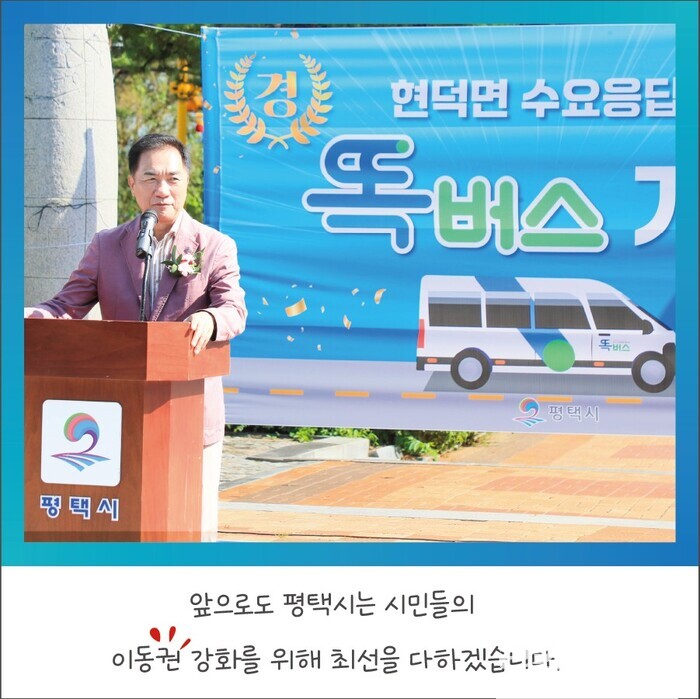 이와 관련해 정장선 평택시장은 22일, 자신의 페이스북을 통해 “현덕면과 서탄면에서도 똑버스가 도입됐다”며 “24일까지 시범운행을 하고, 25일부터 정식 운행한다”고 밝혔다.
