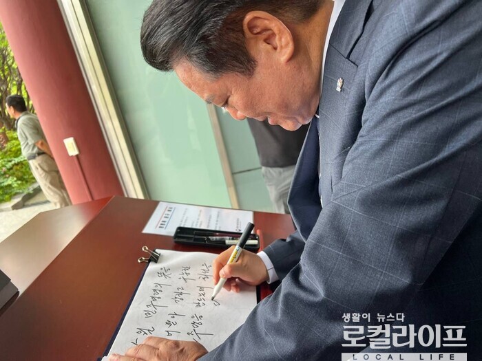 | ▲ 더불어민주당 최고위원 경선에 나선 최대호 안양시장이 중앙당 후보 등록 후 첫 공식 일정으로 국립 5·18민주묘지를 참배했다. 사진은 최대호 시장이 방명록을 적고 있는 모습. (사진출처=최대호 페이스북) |