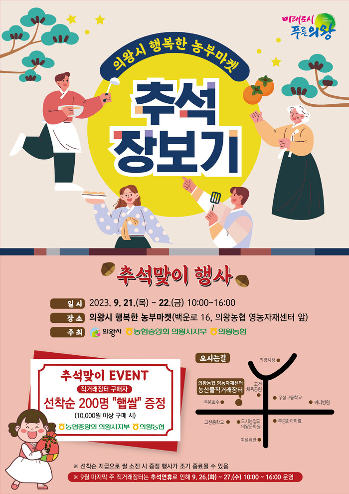 이번 추석맞이 행사에는 기존 장터 참여 농가뿐만 아니라 로컬푸드 판매 농가도 참여해 채소, 햅쌀, 버섯, 과일, 벌꿀 등 다양한 품목의 농산물을 판매한다. 또한 만 원 이상 구매한 시민에게는 농협중앙회 의왕시지부와 의왕농협에서 준비한 햅쌀(500g)을 선착순 증정할 예정이다.