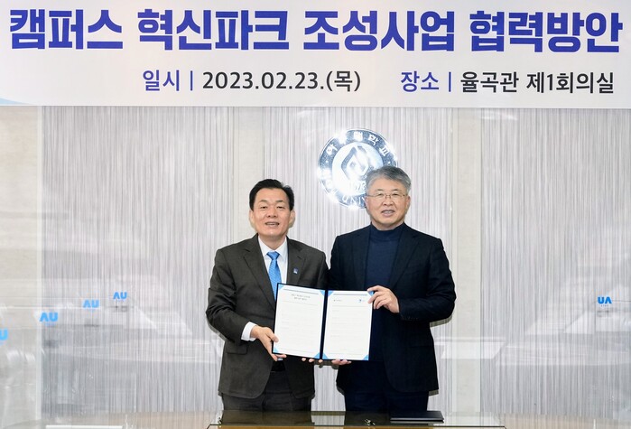 수원시와 아주대학교는 23일 아주대 율곡관에서 ‘캠퍼스 혁신파크 조성사업 협력방안 협약’을 체결하고, 협력을 약속했다. 협약식에는 이재준 수원특례시장, 최기주 아주대 총장 등이 참석했다.