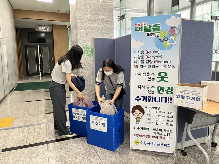 사진/시청 별관 로비에서 ‘헌옷, 헌안경 모으기’ 3차 캠페인을 펼치고 있다.(사진제공=수원시)