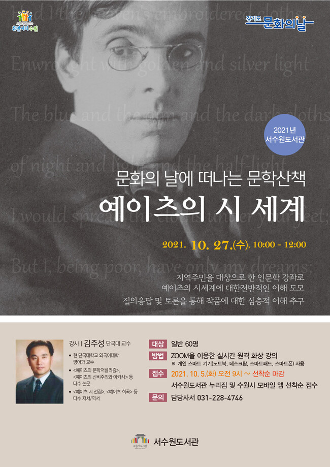 10월에는 ‘예이츠의 시 세계’를 주제로 ‘예이츠의 문학저널리즘’, ‘예이츠의 신비주의와 아카사’ 등 논문을 쓴 단국대학교 영어과 김주성 교수가 강의한다. 서수원도서관 홈페이지와 모바일 앱에서 신청할 수 있다. 26일까지 선착순으로 모집한다.