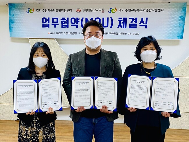 이날 협약식에는 임해영 수원시육아종합지원센터장, 이은정 수원시동부육아종합지원센터장, 박상균 마이에듀교사자람 대표가 참석했다.