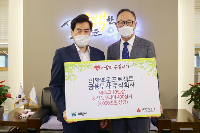 [로컬라이프] 의왕시(시장 김상돈)는 23일, 의왕백운프로젝트금융투자(주)(대표 김양묵)에서 추석을 맞아 어려운 이웃을 위해 사용해 달라며 3000만원 상당의 마스크 10만장과 2000만원 상당의 식품꾸러미 400상자를 기부했다고 밝혔다.