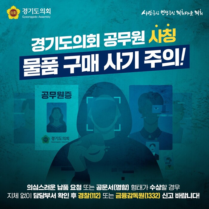 25일, 김진경 의장은 자신의 페이스북을 통해 “공무원 사칭 범죄가 늘고 있다”며 “특히, 최근 경기도에도 공문서(명함 등)를 조작해 납품 요청을 하는 등의 사기행위가 적발됐다”고 밝혔다.