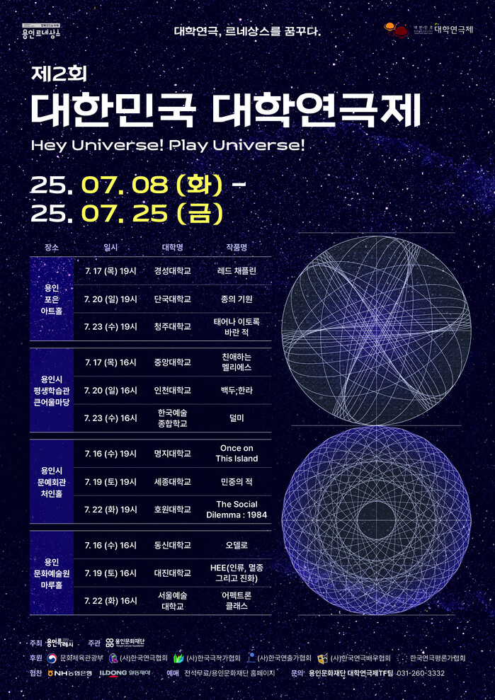 ‘제2회 대한민국 대학연극제’의 자세한 정보는 용인문화재단 홈페이지 또는 전화(☎ 031-260-3338)로 문의하면 된다.