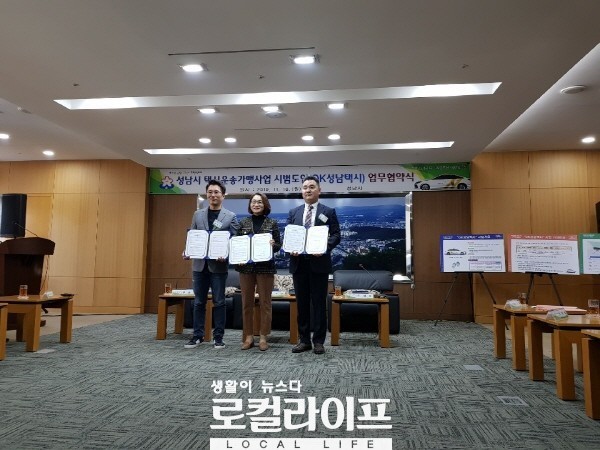 이를 위해 성남시는 18일, 모빌리티 플랫폼 운영사인 카카오모빌리티, 가맹 사업자인 KM 솔루션, 성남시 법인택시 10개사가 설립한 운송가맹점 사업자인 SNT 솔루션과 ‘OK 성남택시 시범 도입에 관한 협약’을 체결했다.