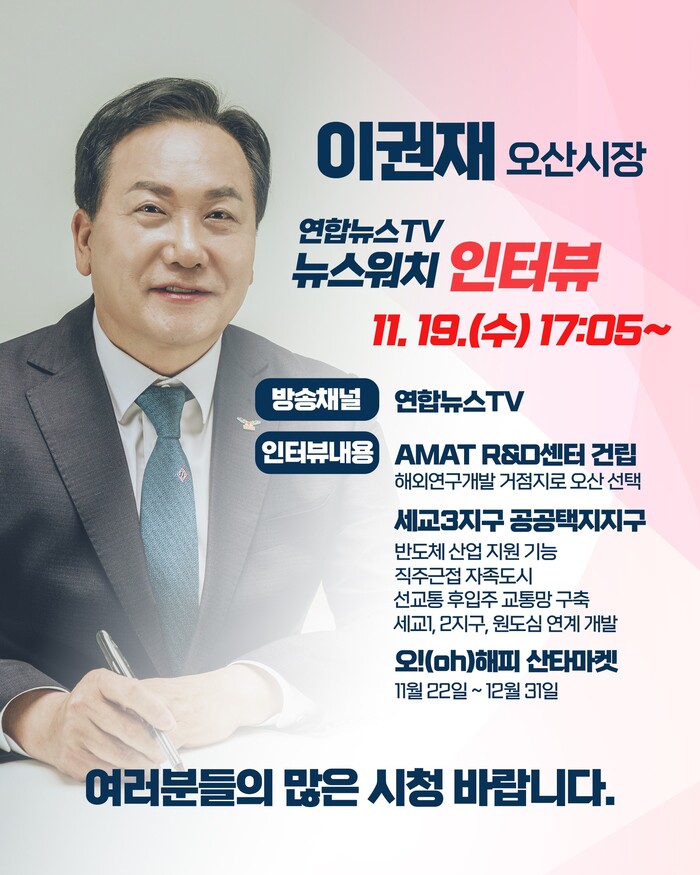 [오산=로컬라이프] 송준형 기자 = 이권재 오산시장은 오는 11월 19일 수요일, 연합뉴스TV 인터뷰를 진행한다.