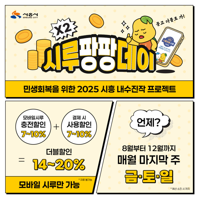 시흥시의 2025년 하반기 민생회복 프로젝트 ‘흥해라 흥세일’의 핵심 이벤트인 시루팡팡데이는 시흥시 지역화폐 모바일 ‘시루’ 충전 시 7~10%를 할인받고, 시루 가맹점에서 결제 시 추가로 7~10%를 할인받는 2배 할인 행사다.