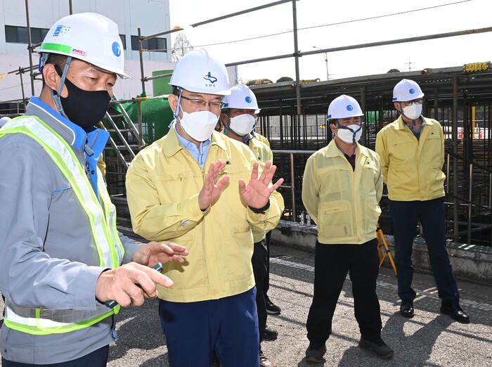 사진/ 조청식 수원시장 권한대행(왼쪽에서 2번째)이 19일 오후 2시 수원공공하수처리장을 방문해 주요 사항을 점검하고 있다.(사진제공=수원시)
