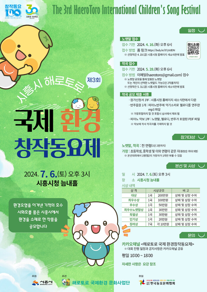 시흥시(시장 임병택)가 주최하고, 해로토로 국제 환경문화사업단이 주관하는 ‘제3회 시흥시 해로토로 국제 환경창작동요제’ 공모가 시작됐다.
