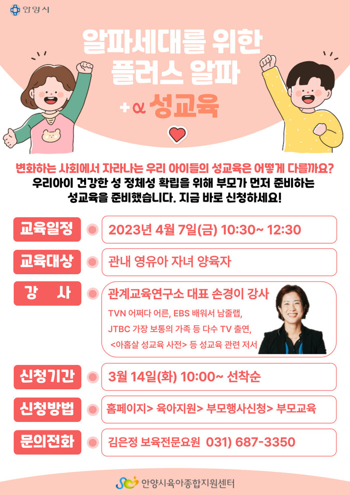 안양시는 부모가 먼저 준비하는 자녀 성교육 ‘알파세대를 위한 플러스 알파 성교육’을 개최하고 오는 14일부터 양육자 1천 명을 선착순으로 모집한다고 9일 밝혔다.