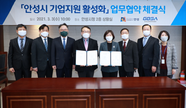 안성시는 3일 안성시청 상황실에서 김보라 안성시장과 유승경 경기도경제과학진흥원장이 참석한 가운데 ‘안성시와 기업지원 활성화를 위한 업무협약(MOU)’을 체결했다.