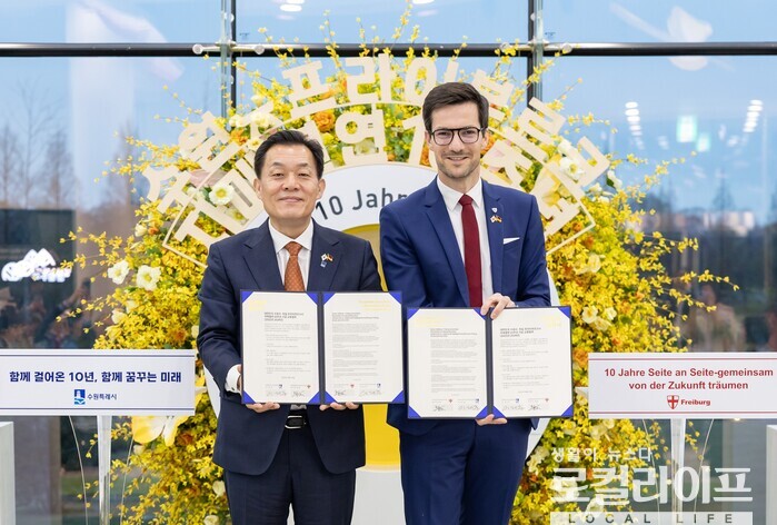 이어 “십 년 전, 프라이부르크시는 이미 전 세계가 주목하는 ‘환경수도’였다. 우리 시도 ‘생태교통수원 2013’을 시작으로 또 다른 환경수도로서 입지를 다져가는 시기였다. 서로 닮은 두 곳은 ‘지속가능한 도시’라는 공통의 비전 아래 자매도시가 되었다”며 “그리고 오늘, 새로운 십 년을 향한 발걸음을 두 도시가 함께 내디뎠다. 기후변화 대응과 환경·에너지 분야의 우수사례를 공유하고, 관련 기술도 적극 나누기로 했다. 스포츠·문화·예술 교류는 물론 청소년들의 글로벌 소통을 위한 다양한 교류협력 프로그램도 함께 약속했다”고 말했다.