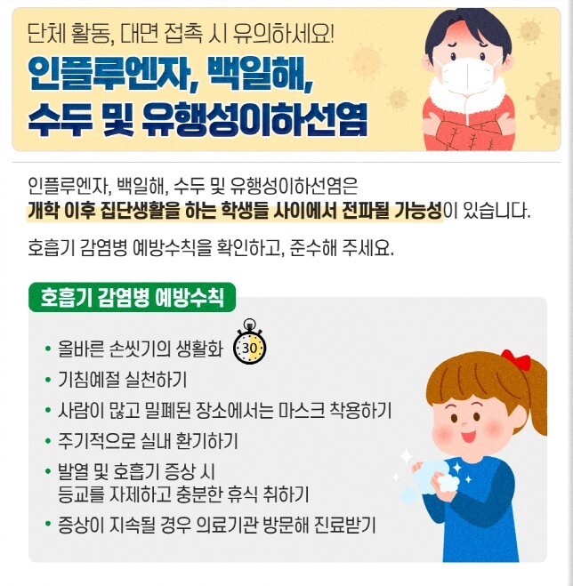 또한, 발열·발진 등 감염병 의심 유증상자는 등교 및 단체 활동을 자제하고, 증상이 지속될 경우 가까운 의료기관을 방문해 신속히 진료를 받아야 한다.