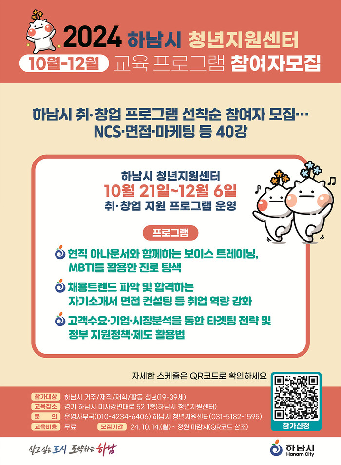 하남시 청년지원센터(경기도 하남시 미사강변대로 52, 하남시 고용복지플러스센터 1층)에서 진행되는 이번 「취·창업 지원 프로그램」은 10월 21일부터 12월 6일까지 청년 취업 역량 강화 등 3개 분야 총 40강 과정으로 운영된다.