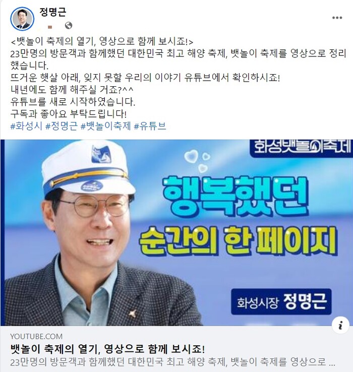 [화성=로컬라이프] 송준형 기자 = 정명근 화성시장이 ‘제14회 화성 뱃놀이 축제’를 정리하는 영상을 자신의 페이스북에 올렸다.