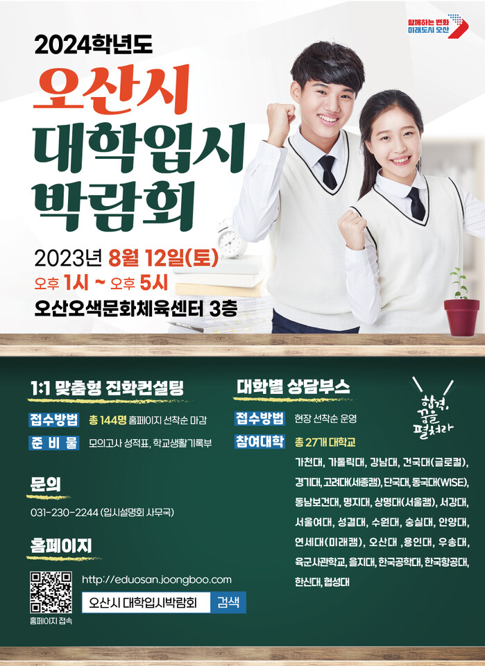 오산시(시장 이권재)는 관내 수험생 및 학부모들에게 대학 입시 최종 전략 정보 제공을 위한 2024학년도 대학입시 박람회 개최를 앞두고 오는 7일 홈페이지를 사전 오픈한다.