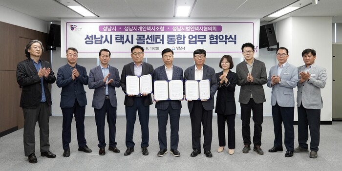 성남시는6월19일 시청 상황실에서‘푸른콜’개인택시조합과‘브랜드콜’법인택시협의회로 이원화돼 있는 택시 콜센터를‘성남콜(가칭)’로 통합하는 업무협약을 체결했다.