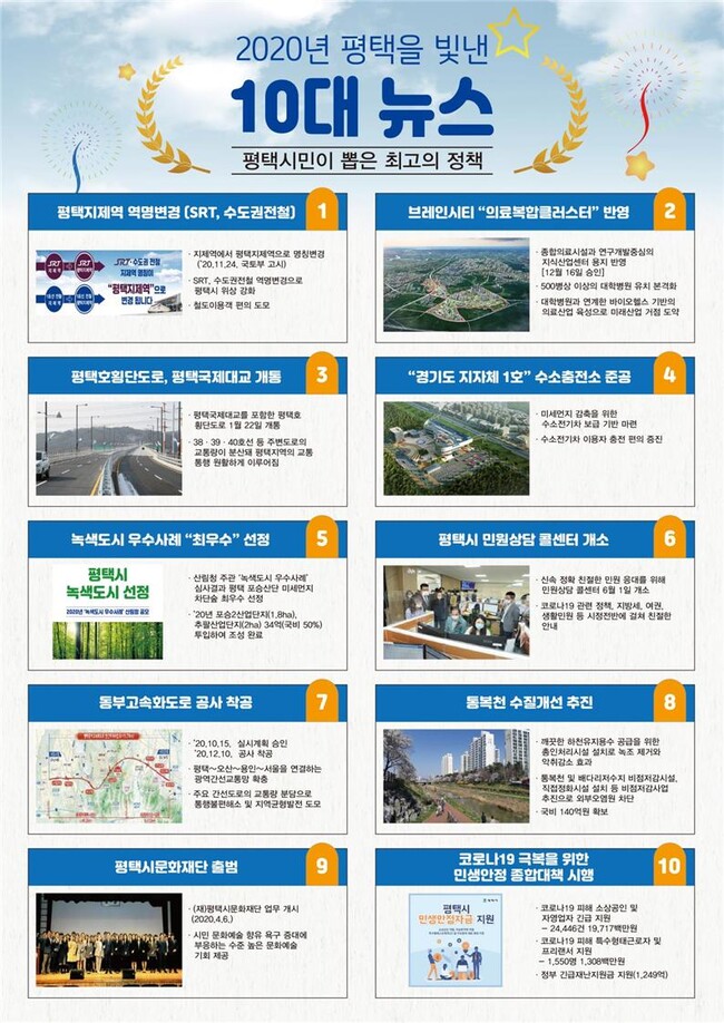 이밖에도 ▲평택시 민원상담 콜센터 개소 ▲동부고속화 도로 착공 ▲통복동 수질개선 추진 ▲평택시 문화재단 출범 ▲코로나19 극복위한 민생안정 시책 등이 10대 뉴스에 선정됐다.