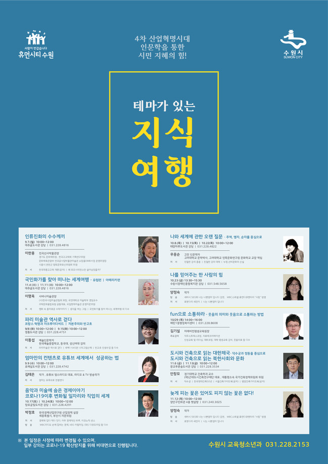 최승래 수원시 교육청소년과장은 “‘테마가 있는 지식 여행’은 코로나19 장기화로 지친 시민들의 마음을 위로하는 유익한 프로그램이 될 것”이라며 “시민을 위한 평생학습 프로그램을 지속해서 마련하겠다”고 말했다.