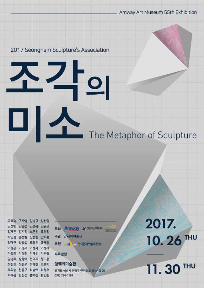 한국암웨이와 성남문화재단이 주최하는 ‘조각의 미소-The Metaphor of Sculpture 展’은 한국문화예술위원회의 ‘2017 문화ㆍ예술 협력 네트워크 지원 사업’의 일환으로 진행된다. 성남조각협회 소속 작가 45명이 참여해 다채로운 주제와 조형 기법의 작품 50여점을 선보일 예정이다.