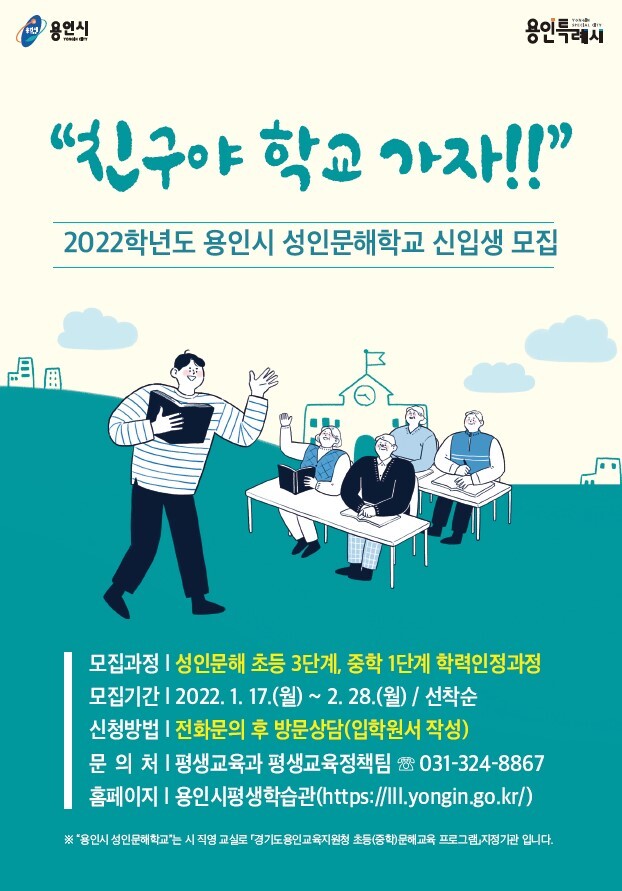 용인시가 오는 28일까지 초·중등 학력을 취득할 수 있는 ‘2022년 성인문해학교’의 신입생을 모집한다.