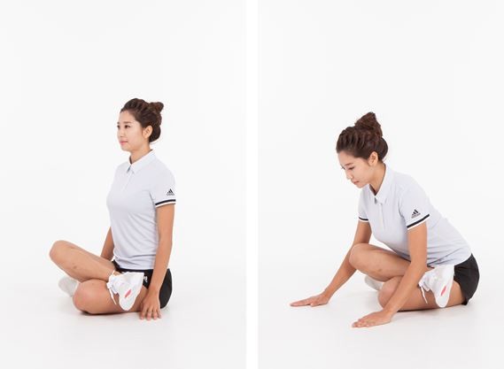 - 가부좌 자세로 앉아 팔을 전방에 두고 상체를 앞으로 15초간 숙인다. 좌우3회씩 반복한다.