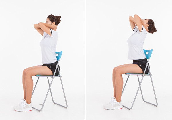 - 양손을 깎지 껴 목 뒤에 대고 팔꿈치를 벌려 뒤로 젖힌다. 5초 멈춘 후 같은 동작을 3회 반복한다.