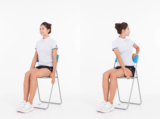- 똑바로 앉아서 옆구리가 당길 때까지 천천히 허리를 돌려준다. 5초 멈춘 후 좌우 3회씩 반복한다.