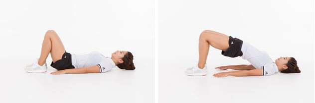 - 무릎을 세우고 누워 엉덩이, 허리, 등의 순서로 천천히 들어올린다. 5초간 유지 후 역순으로 내린다.