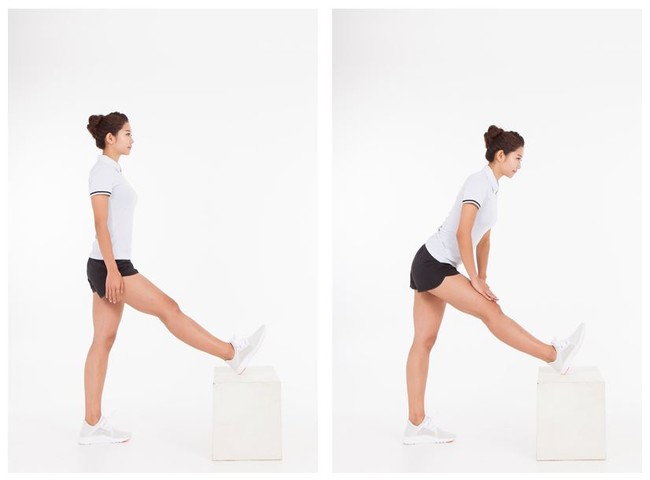 - 높은 곳에 한쪽 다리를 올리고 손으로 무릎을 누른 채 상체를 앞으로 숙인다. 15초간 유지, 좌우 2회씩 반복.