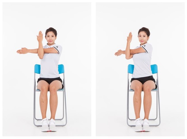 - 허리를 펴고 앉아 왼팔을 오른쪽으로 뻗는다. 오른팔로 왼팔을 걸고 가슴 쪽으로 당긴다. 좌우 10초씩 2회 반복.