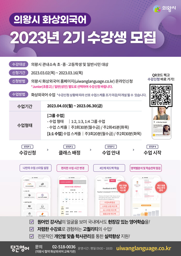 이번 2기 교육은 4월 3일 시작해 6월 30일까지 12주 과정으로 진행되며, 의왕시 거주 학생부터 성인까지 누구나 신청할 수 있다. 희망하는 학습 언어(영어, 중국어)와 수강 형태(1:1~1:4)를 선택해 의왕시 화상외국어 학습 전용 홈페이지에서 신청하면 된다.