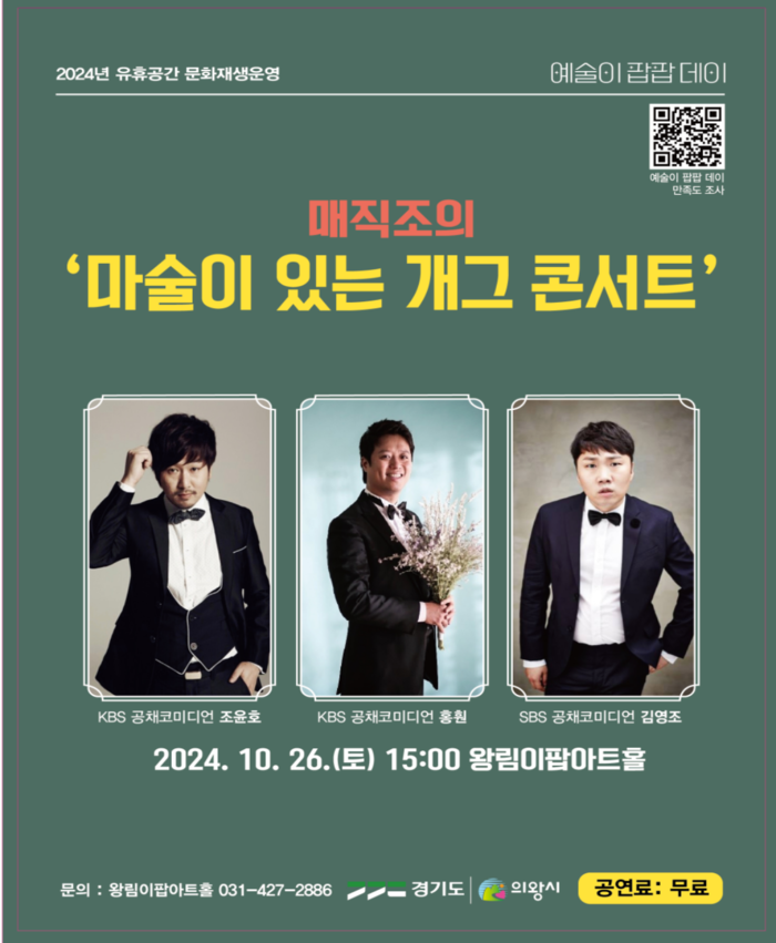 의왕시는 오는 10월 26일 오후 3시 왕림이팝아트홀에서 ‘예술이 팝팝 데이’ 시즌2 사업의 일환으로 매직조의 ‘개그콘서트’ 공연을 선보인다.