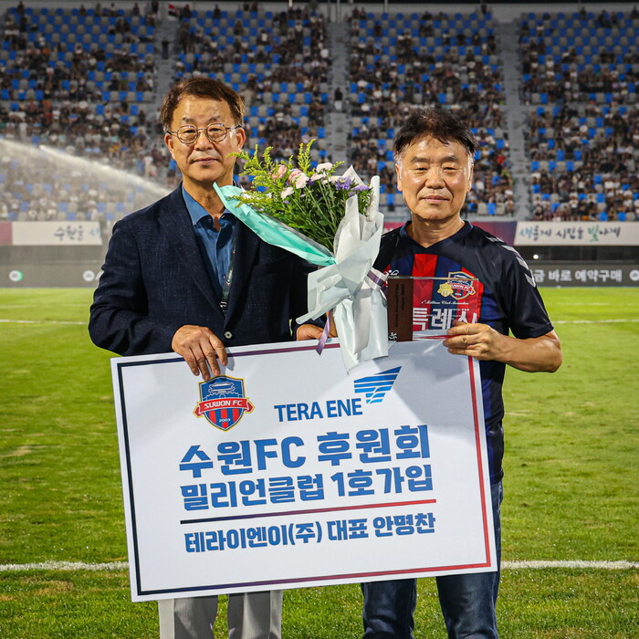 수원FC는 지난 8월 10일 대전하나시티즌과 홈경기 하프타임 때 밀리언클럽 1호 가입자인 테라이엔이(주) 안명찬 대표에게 감사패를 전달했다. 안 대표는 1000만 원을 후원했다.