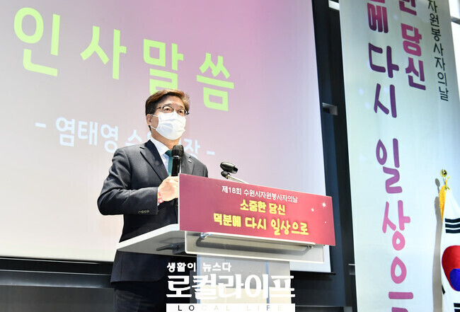 이어 오늘(2) ‘자원봉사자의 날을 맞아 수원컨벤션센터에서 기념식을 가졌다. 우리시의 자원봉사는 음식을 나누는 공유 냉장고나 폐장난감을 재활용하고 분리 배출하는 장난감의 재탄생사업, 강원 고성군, 전남 구례군, 경북 포항시와 같은 산불, 집중호우, 지진 피해 지역에 대한 자원봉사 활동 등으로 전국적으로 잘 알려져 있다여기에 작년과 올해 코로나 팬데믹 상황에서 더욱 빛을 발한 활동 덕분에 국가적으로도 인정받게 됐다. 작년 초, 마스크가 동이 났을 때 재봉 기술을 보유한 자원봉사자 966분이 천 마스크 52179개를 만들어 취약계층과 방역봉사자 등에 나누어주셨다고 그동안 수원시민들의 자원봉사 사례를 자랑했다.