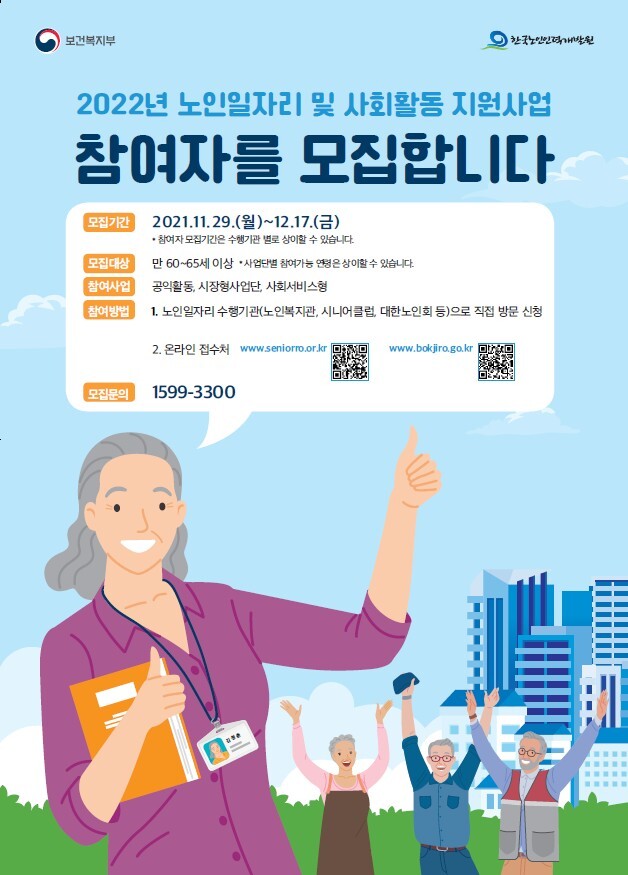 참여를 원하는 어르신은 유형별 수행기관에 방문하거나 노인일자리여기(www.seniorro.or.kr), 복지로(www.bokjiro.go.kr)에서 신청하면 된다.