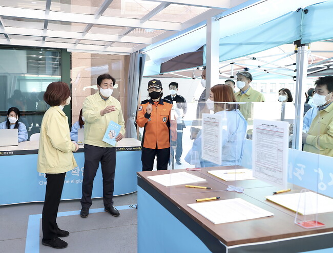 시흥시(시장 임병택)가 75세 이상 노인대상 백신접종을 앞둔 4월 1일, 정왕평생학습관 예방접종센터에서 모의훈련을 실시했다.