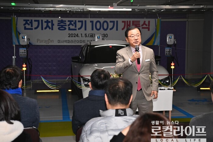 [하남=로컬라이프] 송준형 기자 = 하남시 미사역파라곤아파트에서 전기차 충전기 100기 개통식이 5일 개최됐다.