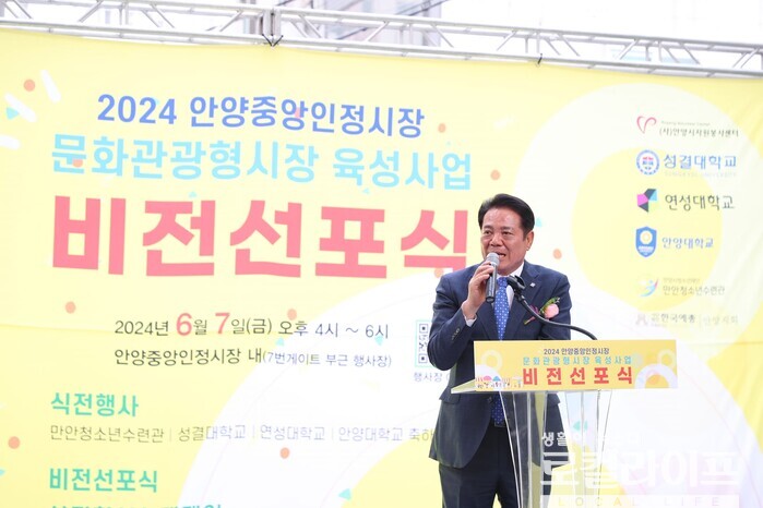 | ▲ 최대호 안양시장이 ‘2024 안양중앙인정시장 문화관광형시장 육성사업 비전선포식’에 참석해 축사를 하고 있다. (사진출처=최대호 페이스북) |