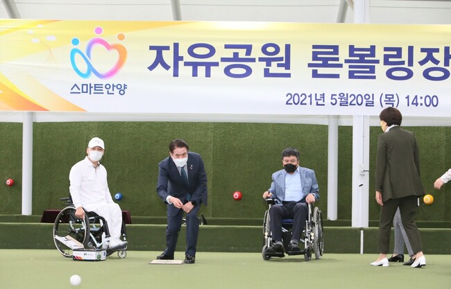 [로컬라이프] 안양시는 20일 자유공원 론볼링장(동안구 평촌대로 76) 시설을 대폭 개선해 개장식을 가졌다며, 앞으로 거동이 불편한 장애인과 어르신들이 날씨에 상관없이 론볼링을 즐길 수 있게 됐다고 밝혔다.