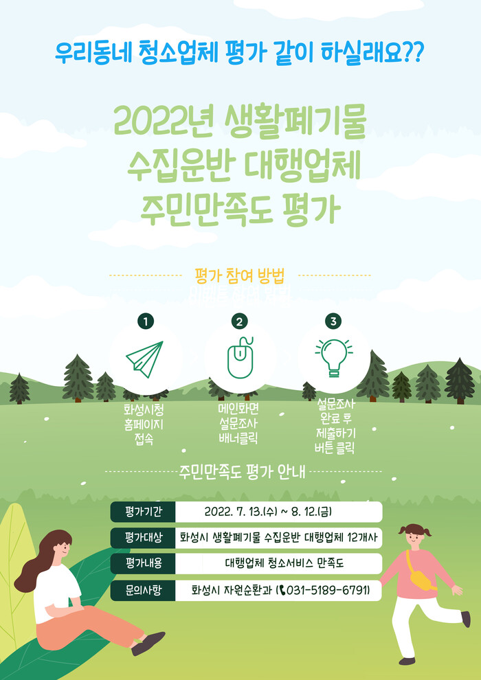 7월 13일부터 8월 12일까지 실시되는 이번 조사는 생활폐기물 수집‧운반 대행업체의 청소서비스에 대한 만족도를 평가해 시민들에게 보다 나은 청소서비스를 제공하기 위해 실시된다.