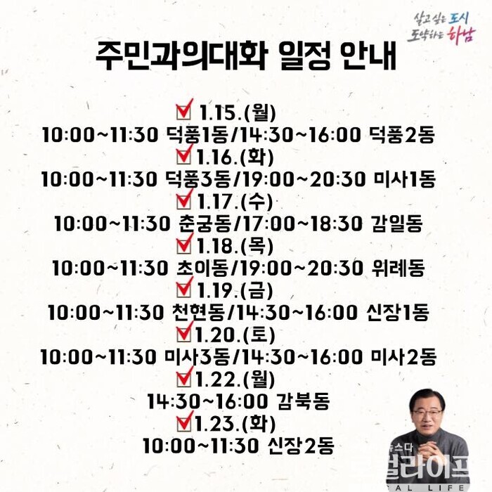 [하남=로컬라이프] 송준형 기자 = 이현재 하남시장이 ‘2024년 신년 주민과의 대화’를 이달 15일부터 23일까지 동별로 진행한다.
